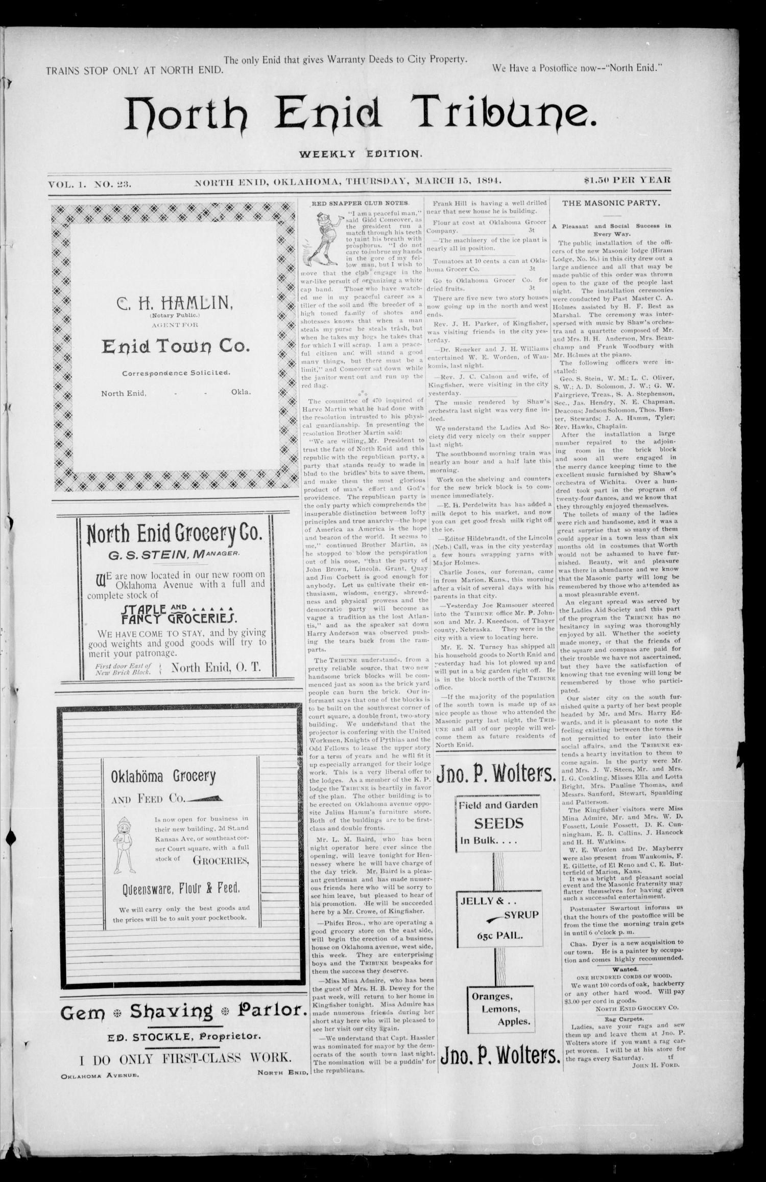 During this time North Enid was known variously as the depot town, Station of Enid, Railroad Enid, Old Enid, North Town, or North Enid, but the government town was known as Government Enid or South Enid. Despite the naming controversy the south town received a post office as Enid on August 25, 1893, and it was not until the following January 19 that a post office was established at North Enid. During a year-long struggle between the two towns North Enid maintained a population of approximately fifteen hundred. Its two-block-long business section boasted a variety of retail establishments, but the situation changed dramatically when they lost the fight for economic control of the area.