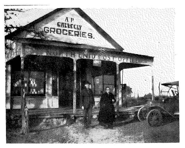1918 - Charlie and Katie Sowle in front of post office and grocery store.